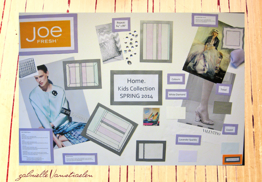 In my Line Planning and Visual Communication class, I had to design a home line for the private label I had chosen Joe Fresh Kids for the Spring 2014 season. I decided to create a bed in the bag ensemble that includes a duvet cover, a sham, a flat sheet, a fitted sheet, and a pillowcase. Sold as separates I chose to create a bed skirt as well as a decorative pillow for added flare to the collection. The main purpose of this project was to design a print and a repeat of that print suitable to my target market to use in the home line and reference different sources of inspiration for my color, style, and texture choices.